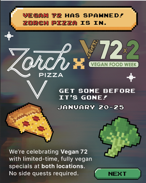 It’s Vegan Week, baby — and Zorch pizza is going full power-up mode.